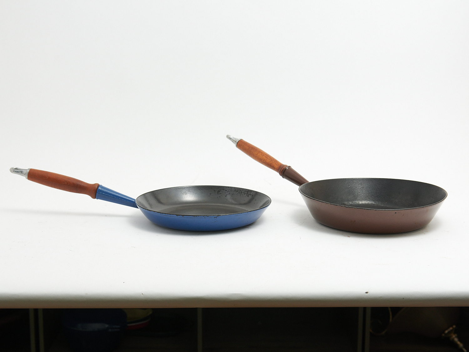 TWO LE CREUSET CAST IRON WOODEN HANDLED FRYPANS, DIA.28CM, LEONARD JOEL LOCAL DELIVERY: MEDIUM