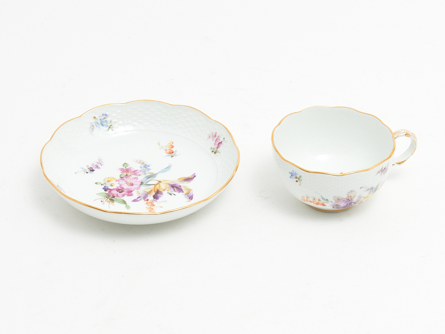 A PORCELAIN FLORAL DECORATED CUP AND SAUCER, EACH WITH MEISSEN MARKS TO BASE, LEONARD JOEL LOCAL DELIVERY: SMALL