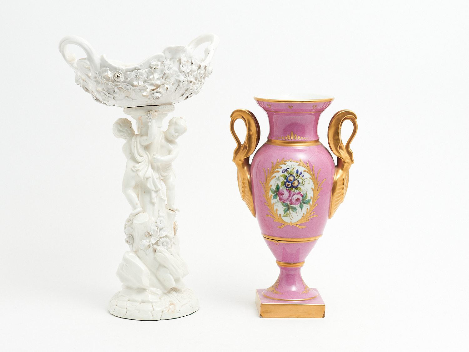 A PORCELAIN CENTREPIECE (A/F) TOGETHER WITH LIMOGES STYLE URN (A/F), H.44CM, LEONARD JOEL LOCAL DELIVERY: MEDIUM