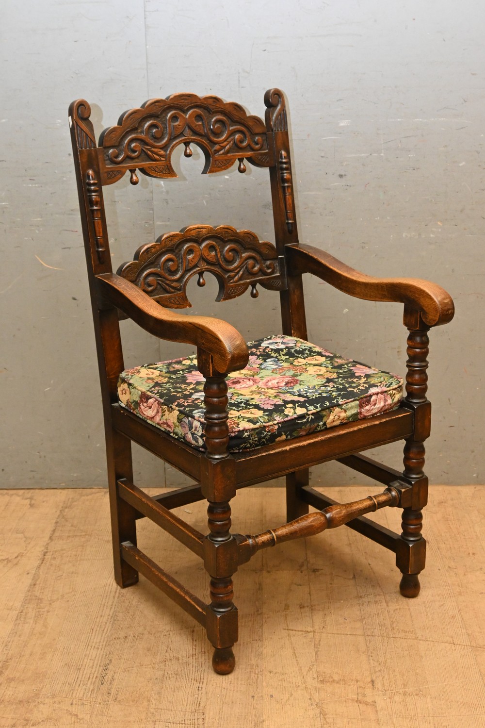 A CARVED TIMBER ARMCHAIR (A/F) ( 108H X 54W X 54D CM) (LEONARD JOEL DELIVERY SIZE: LARGE)
