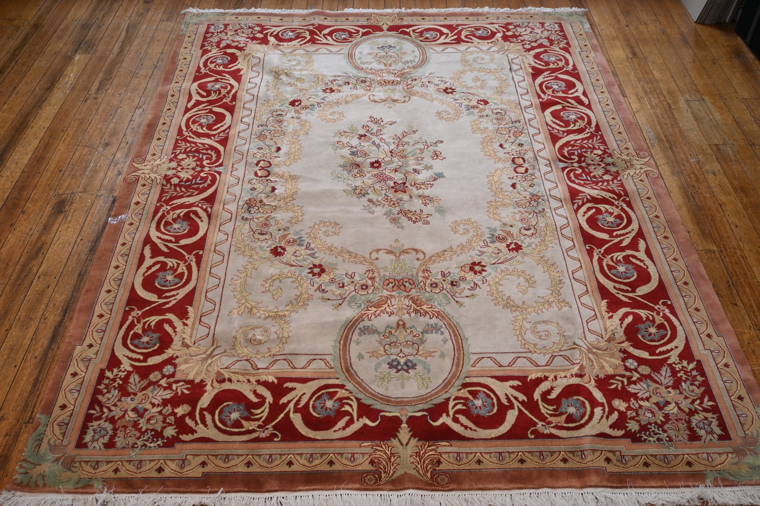 A LARGE HAND KNOTTED FRENCH AUBUSSEN DESIGN 100% WOOL DENCE PILE COLOUR FAST RUG ( 365 X 268 CM) (PLEASE NOTE THIS HEAVY ITEM MUST BE REMOVED BY CARRIERS AT THE CUSTOMER'S EXPENSE. LEONARD JOEL STAFF CANNOT ASSIST CARRYING THIS ITEM) (X-LARGE ITEM)