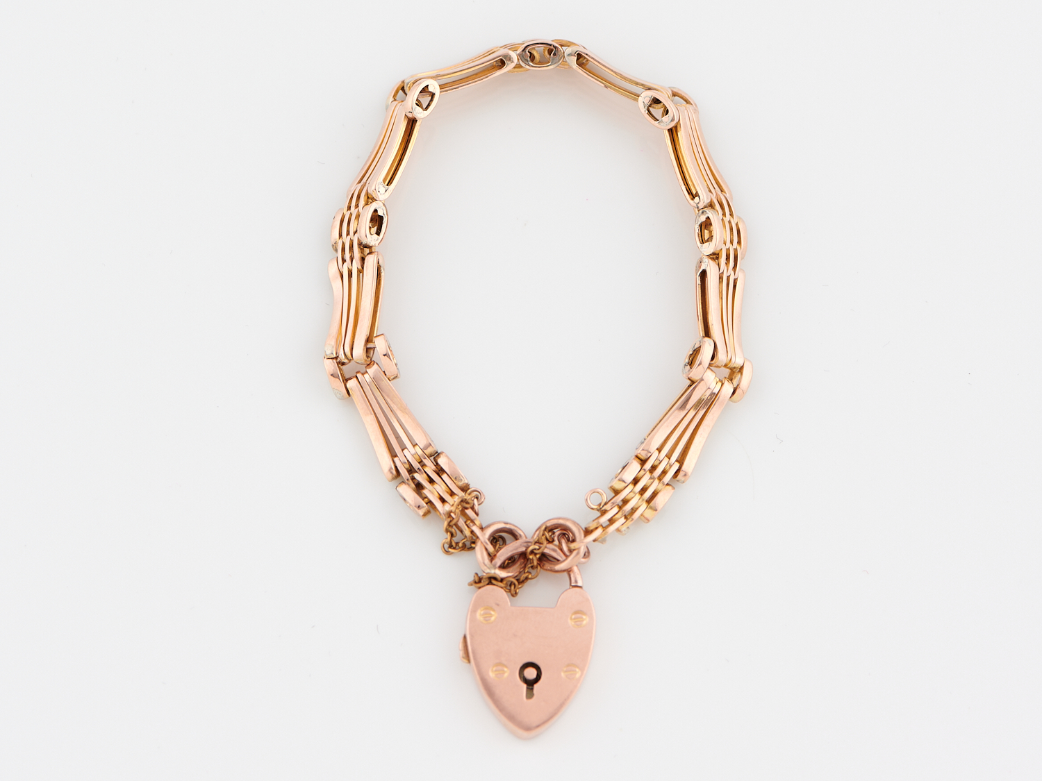 A GATE LINK BRACELET WITH HEART PADLOCK IN 9CT GOLD, LENGTH 180MM, 22.3GMS