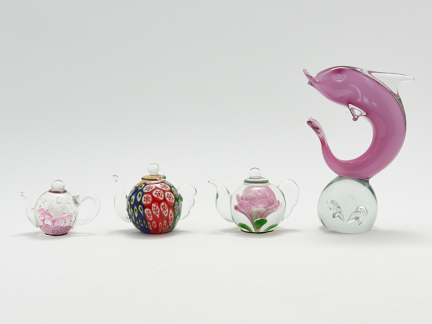A GROUP OF GLASS PAPERWEIGHTS IN THE FORM OF TEAPOTS AND A DOLPHIN, H.20CM (TALLEST), LEONARD JOEL LOCAL DELIVERY: SMALL