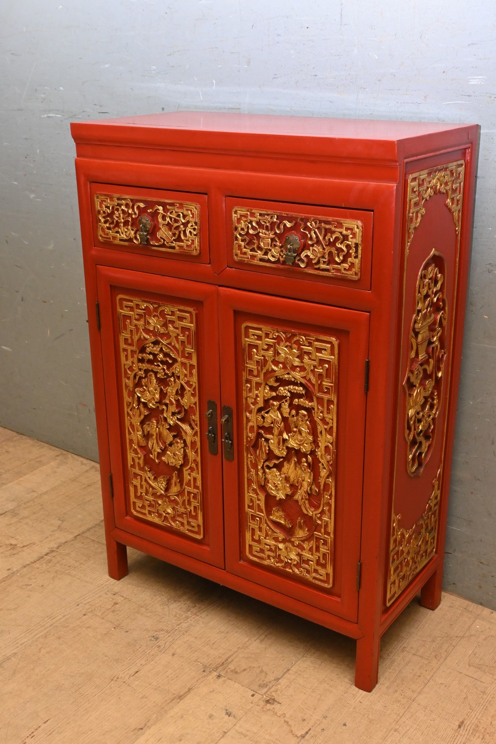 A CHINESE RED AND GILT CABINET ( 92H X 62W X 31D CM) (LEONARD JOEL DELIVERY SIZE: LARGE)