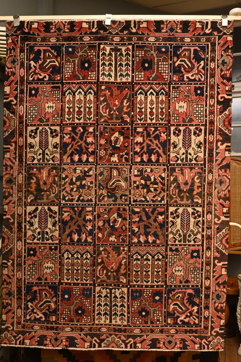 A TRIBAL PERSIAN BAKHTIAR RUG. 100% SOLID AND DENSE WOOL, ORGANIC DYES. HAND-KNOTTED TRIBAL BAKHTIARI WEAVE WITH TRADITIONAL "GARDEN" DESIGN WITH PANELS CONTAINING GARDEN THEMES OF WILLOW TREES, FLORAL SHRUBS, PALMETTES. BORDER OF PALMETTES & TENDRILS. SIZE: 200 X 138 CM. ORIGIN: PERSIA - RRP: $1,900. DOCUMENTATION OF AUTHENTICITY INCLUDED.