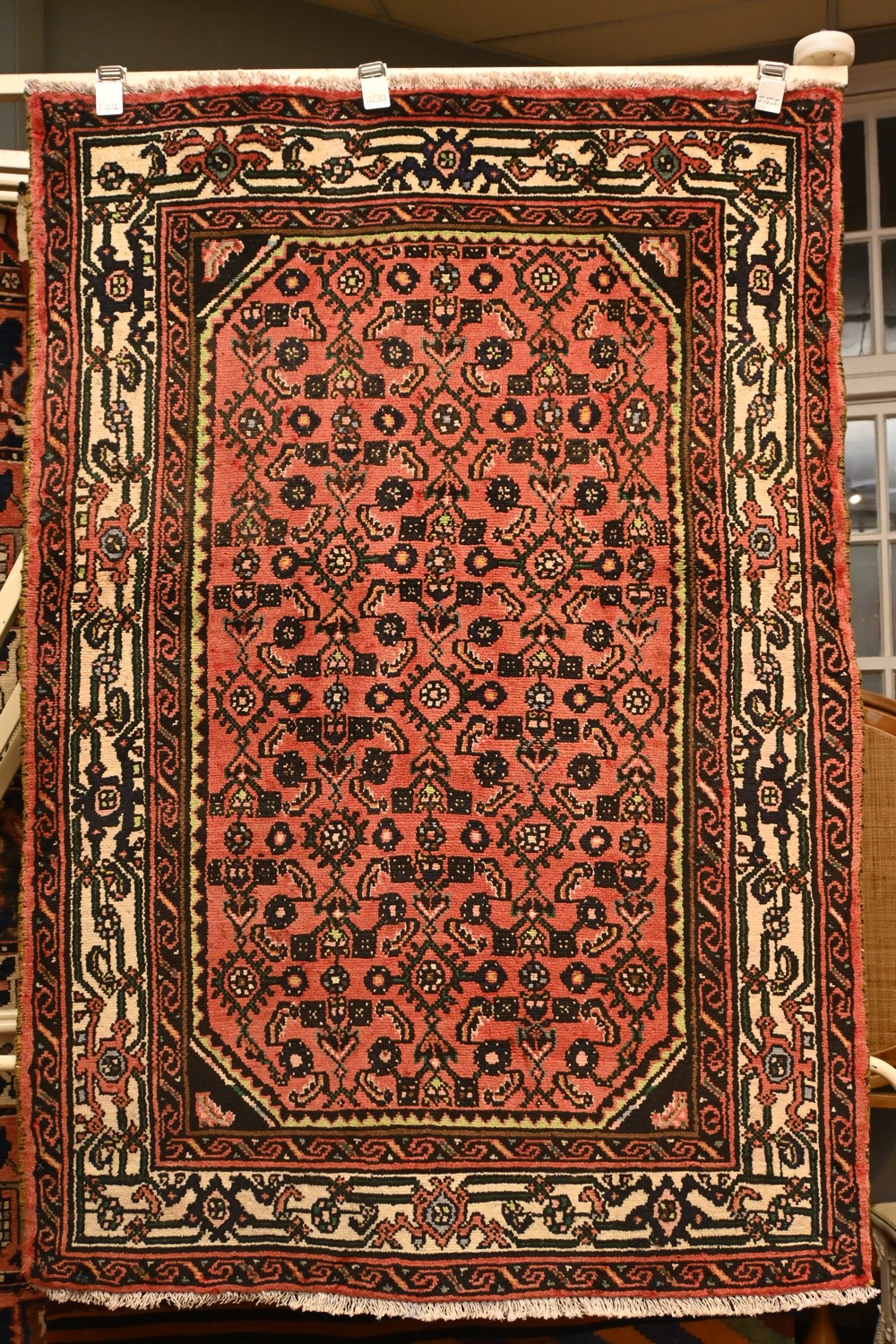 A PERSIAN ENJELAS RUG 100% WOOL & NATURAL DYES. HAND-KNOTTED VILLAGE WEAVE WITH TRIBAL DESIGN OF ALL OVER HERATI MAHI PATTERNS ON A RED TONE FIELD. BORDER OF GEOMETRIC TRIBAL DESIGNS. SIZE: 147 X 106 CM. ORIGIN: IRAN - RRP: $1,200. DOCUMENTATION OF AUTHENTICITY INCLUDED.