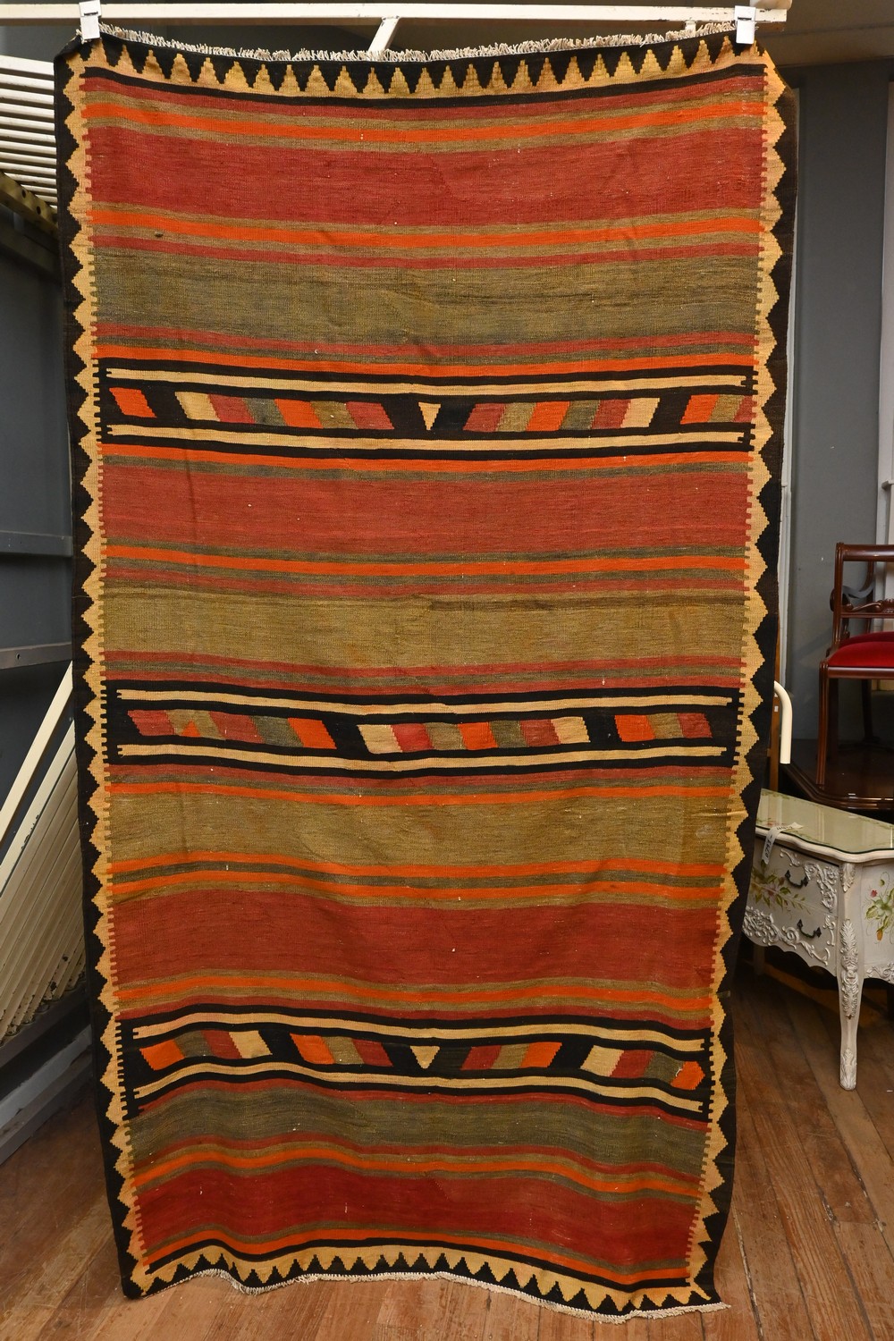 PERSIAN COLOURFUL KURDISH KILIM, GEOMETRIC NOMADIC MOTIFS, 100% VEGETABLE DYES, WOOLLEN WEAVE. SIZE: 240 X 133 CM. ORIGIN: IRAN- RRP: $2,400. DOCUMENTATION OF AUTHENTICITY INCLUDED.