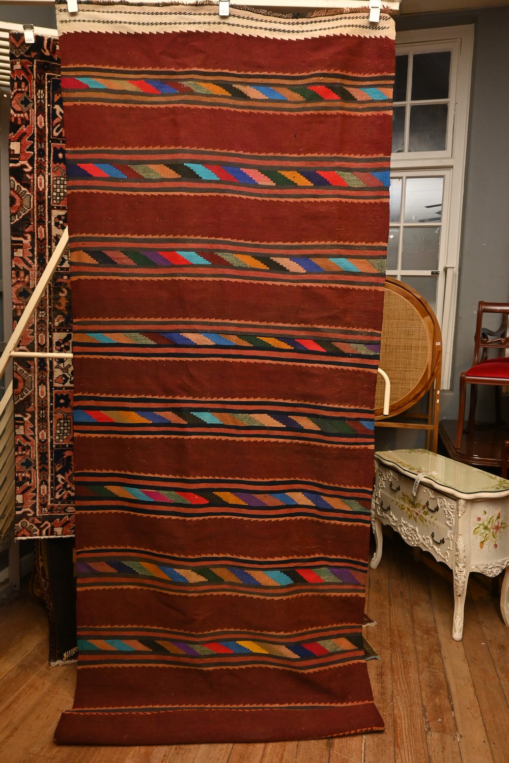 PERSIAN COLOURFUL KURDISH KILIM, GEOMETRIC NOMADIC MOTIFS, 100% VEGETABLE DYES, WOOLLEN WEAVE. SIZE: 325 X 112 CM, ORIGIN: IRAN- RRP: $2,200. DOCUMENTATION OF AUTHENTICITY INCLUDED