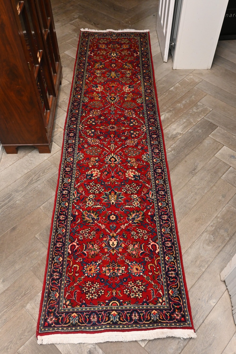 A FINELY HAND KNOTTED PERSIAN SAROUQ HALL RUNNER, 100% WOOL & WEAVE. HAND-KNOTTED CITY WEAVE WITH CLASSIC PERSIAN FLORAL ALL OVER DESIGN PALMETTES AD FLORAL SPRAYS AND SCROLLS ON A RUBY RED FIELD. BORDER OF PALMETTES IN NAVY BLUE. SIZE: 310 X 80 CM. ORIGIN: PERSIA - RRP: $2,900. DOCUMENTATION OF AUTHENTICITY INCLUDED.