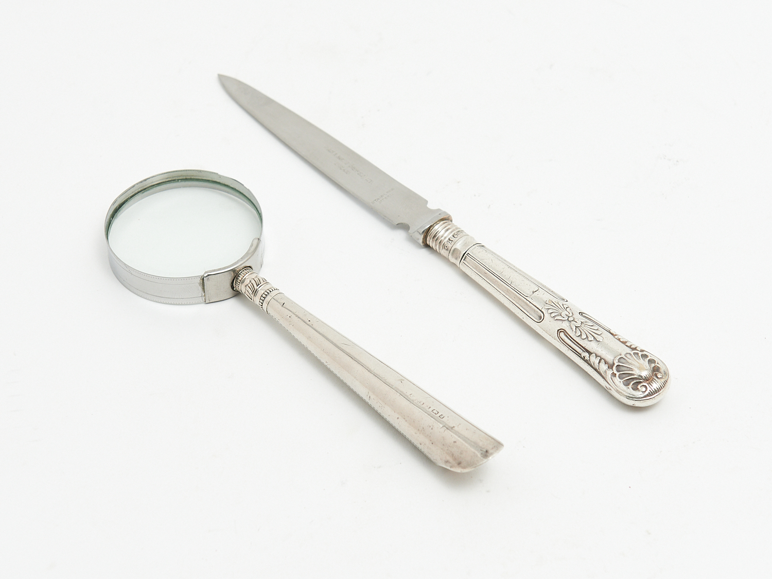 A STERLING SILVER HANDLED MAGNIFYING GLASS AND A STERLING SILVER COLLARED LETTER OPENER, L.21CM, LEONARD JOEL LOCAL DELIVERY: SMALL