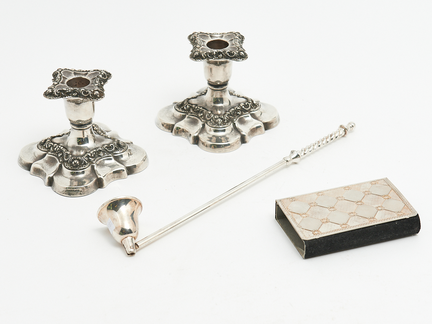 A PAIR OF SILVER PLATED CANDLESTICKS, MATCHBOX COVER AND CANDLE SNUFFER H.9CM (LARGEST), LEONARD JOEL LOCAL DELIVERY: SMALL