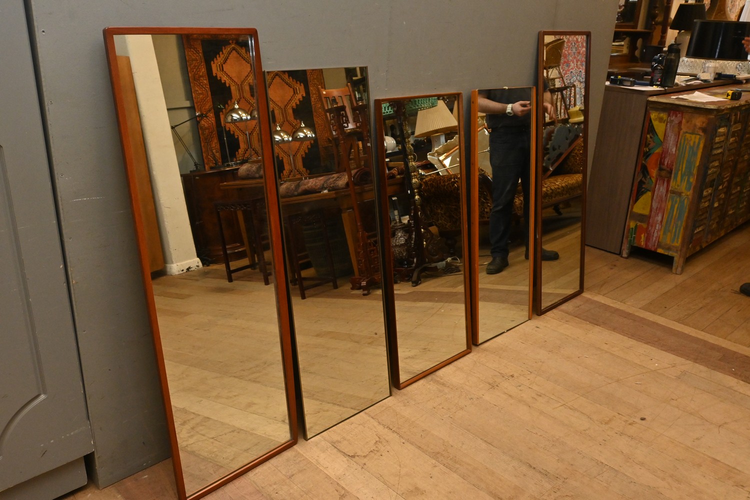 A COLLECTION OF FIVE MID CENTURY TEAK FRAMED MIRRORS. (A/F) (139H X 46W CM) (LEONARD JOEL DELIVERY SIZE: X LARGE)