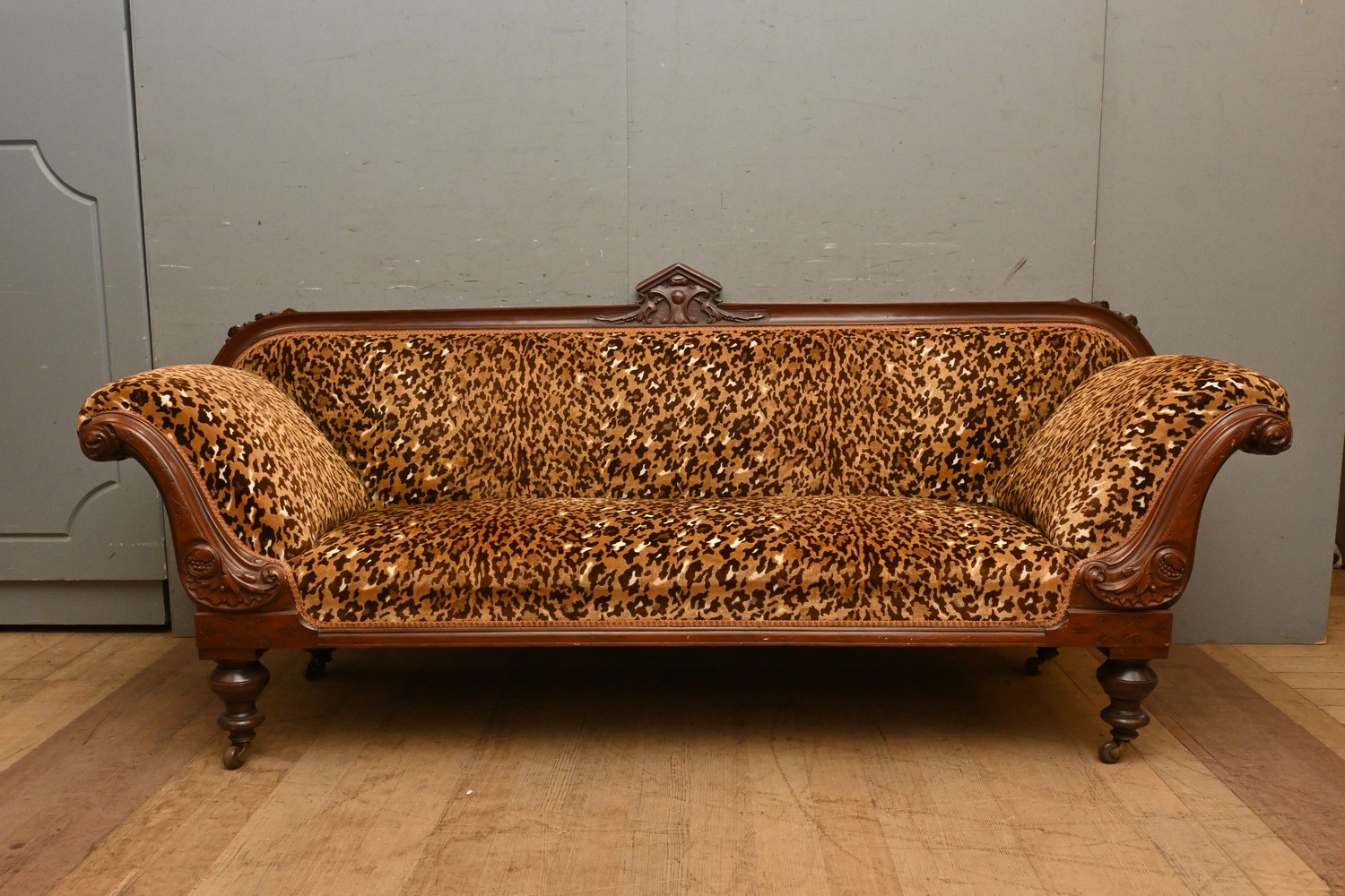 A VICTORIAN CEDAR AND UPHOLSTERED SOFA, COVERED IN LEOPARD PRINT FABRIC (A/F) (94H X 230W X 68D CM) (PLEASE NOTE THIS HEAVY ITEM MUST BE REMOVED BY CARRIERS AT THE CUSTOMER'S EXPENSE. LEONARD JOEL STAFF CANNOT ASSIST CARRYING THIS ITEM) (X-LARGE ITEM)