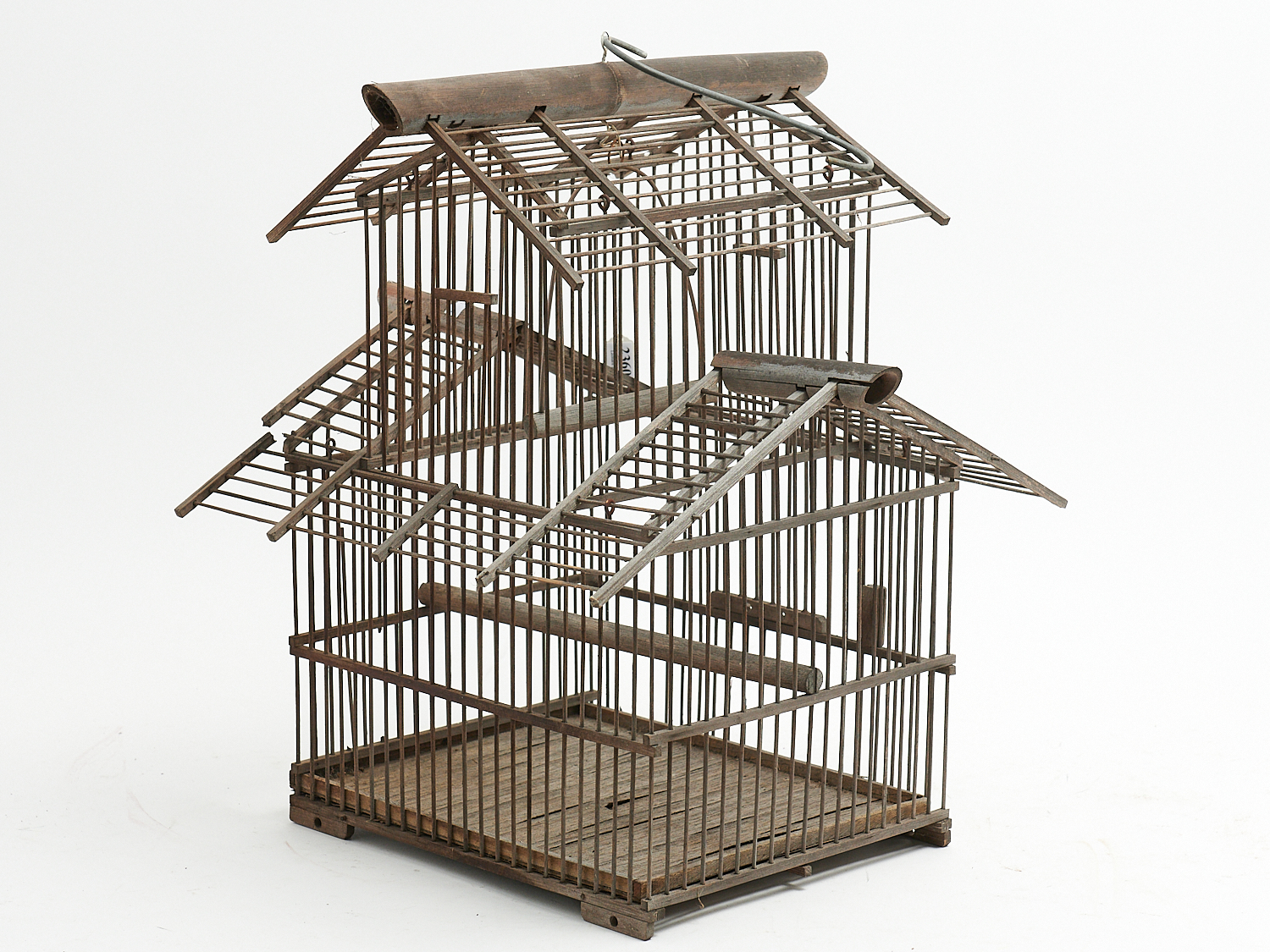 A VINTAGE WOOD AND WIRE BIRDCAGE H.46CM, LEONARD JOEL LOCAL DELIVERY: MEDIUM