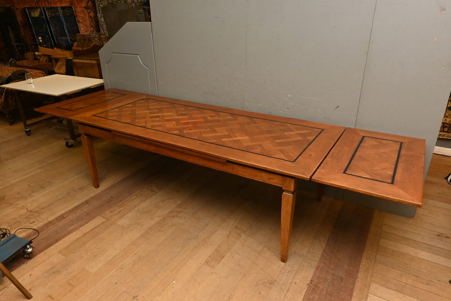 A FRENCH STYLE TAPERED LEG DINING TABLE WITH PARQUETRY TOP. (A/F) (79H X 360W X 106D CM) (PLEASE NOTE THIS HEAVY ITEM MUST BE REMOVED BY CARRIERS AT THE CUSTOMER'S EXPENSE. LEONARD JOEL STAFF CANNOT ASSIST CARRYING THIS ITEM) (X-LARGE ITEM)