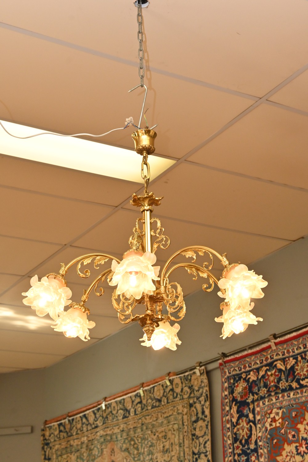 AN ITALIAN SIX-LIGHT BRASS CHANDELIER WITH FLORAL MOULDED GLASS SHADES (68H X 75D CM) (PLEASE NOTE THIS HEAVY ITEM MUST BE REMOVED BY CARRIERS AT THE CUSTOMER'S EXPENSE. LEONARD JOEL STAFF CANNOT ASSIST CARRYING THIS ITEM) (X-LARGE ITEM)