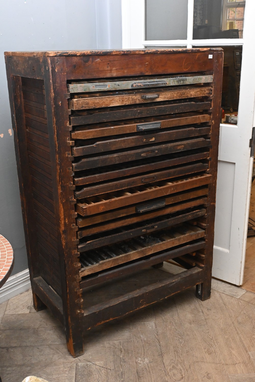 AN EARLY 20TH CENTURY LETTERPRESS CABINET, CIRCA 1930'S (A/F) (151H X 98W X 58D) (PLEASE NOTE THIS HEAVY ITEM MUST BE REMOVED BY CARRIERS AT THE CUSTOMER'S EXPENSE. LEONARD JOEL STAFF CANNOT ASSIST CARRYING THIS ITEM) (X-LARGE ITEM)