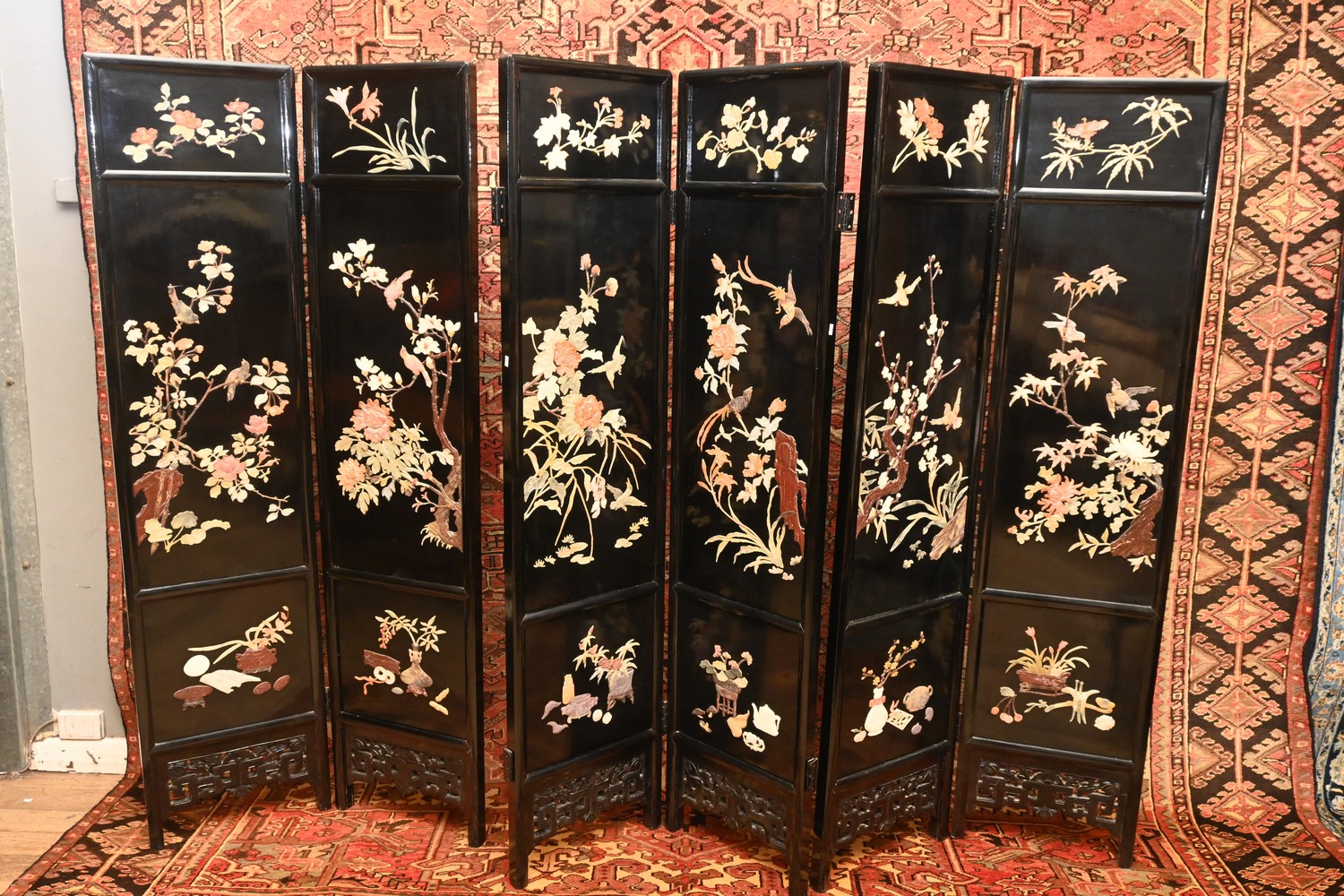 A BLACK LACQUERED STONE INLAID SIX PANEL SCREEN (A/F) ( 183H X 43W PER PANEL) (LEONARD JOEL DELIVERY SIZE: X-LARGE)
