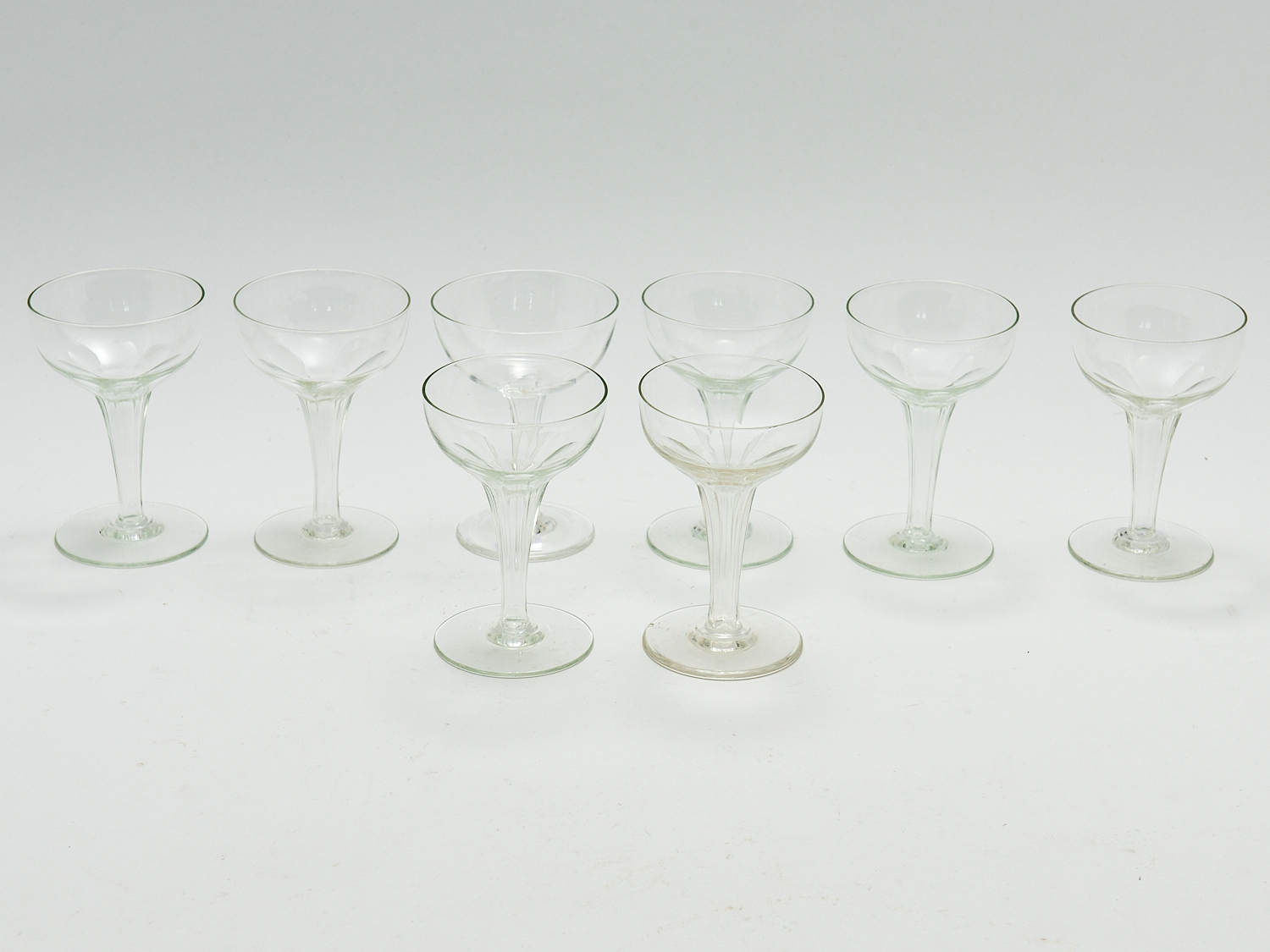 A SUITE OF 7 STOURBRIDGE HAND BLOWN HOLLOW STEM CHAMPAGNE GLASSES H.12.5CM, LEONARD JOEL LOCAL DELIVERY: MEDIUM