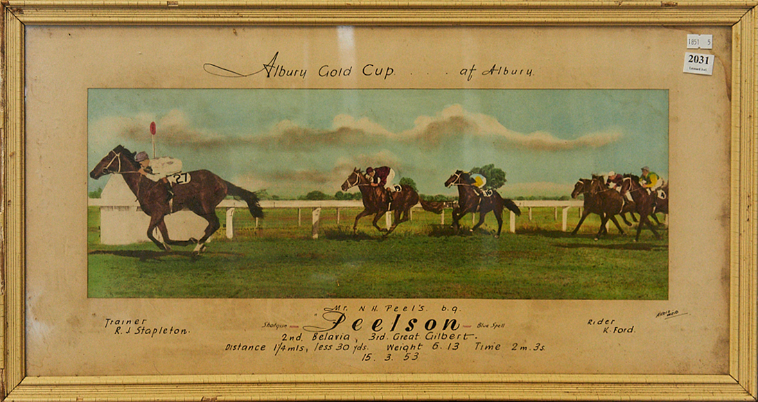 AN ALBURY GOLD CUP HAND COLOURED PHOTO - HELEN SIMPSON (ARTIST) H.35CM X W.65CM, LEONARD JOEL LOCAL DELIVERY: MEDIUM