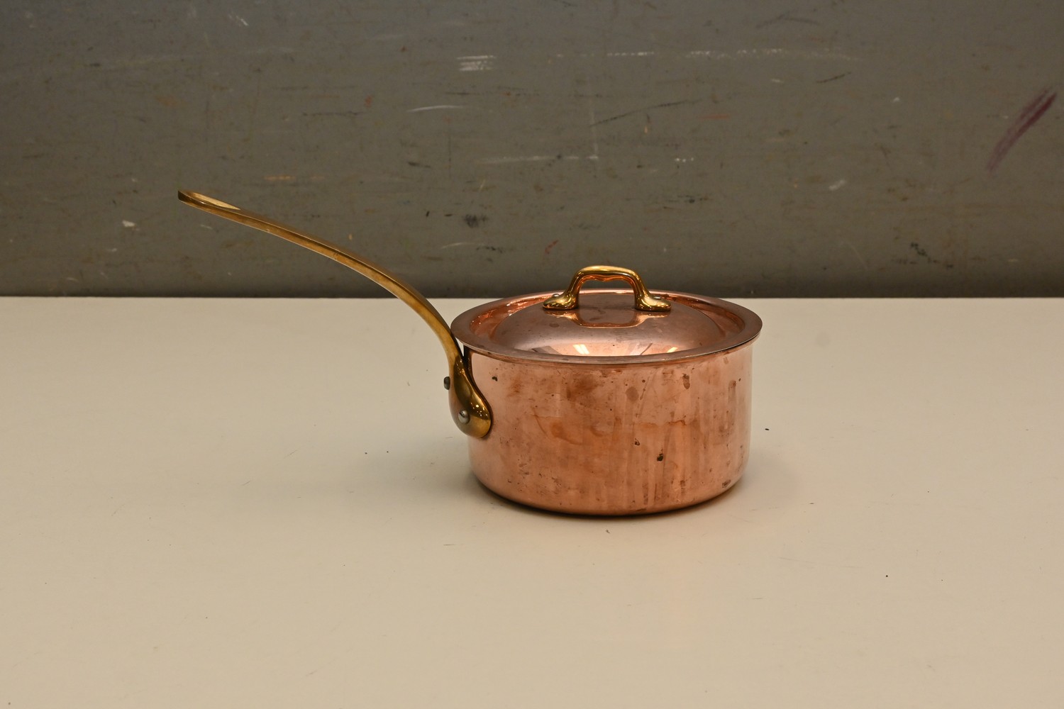 A SMALL FRENCH MAUVIEL COPPER LIDDED SAUCEPAN (13H X 33D CM)(LEONARD JOEL DELIVERY SIZE: SMALL)
