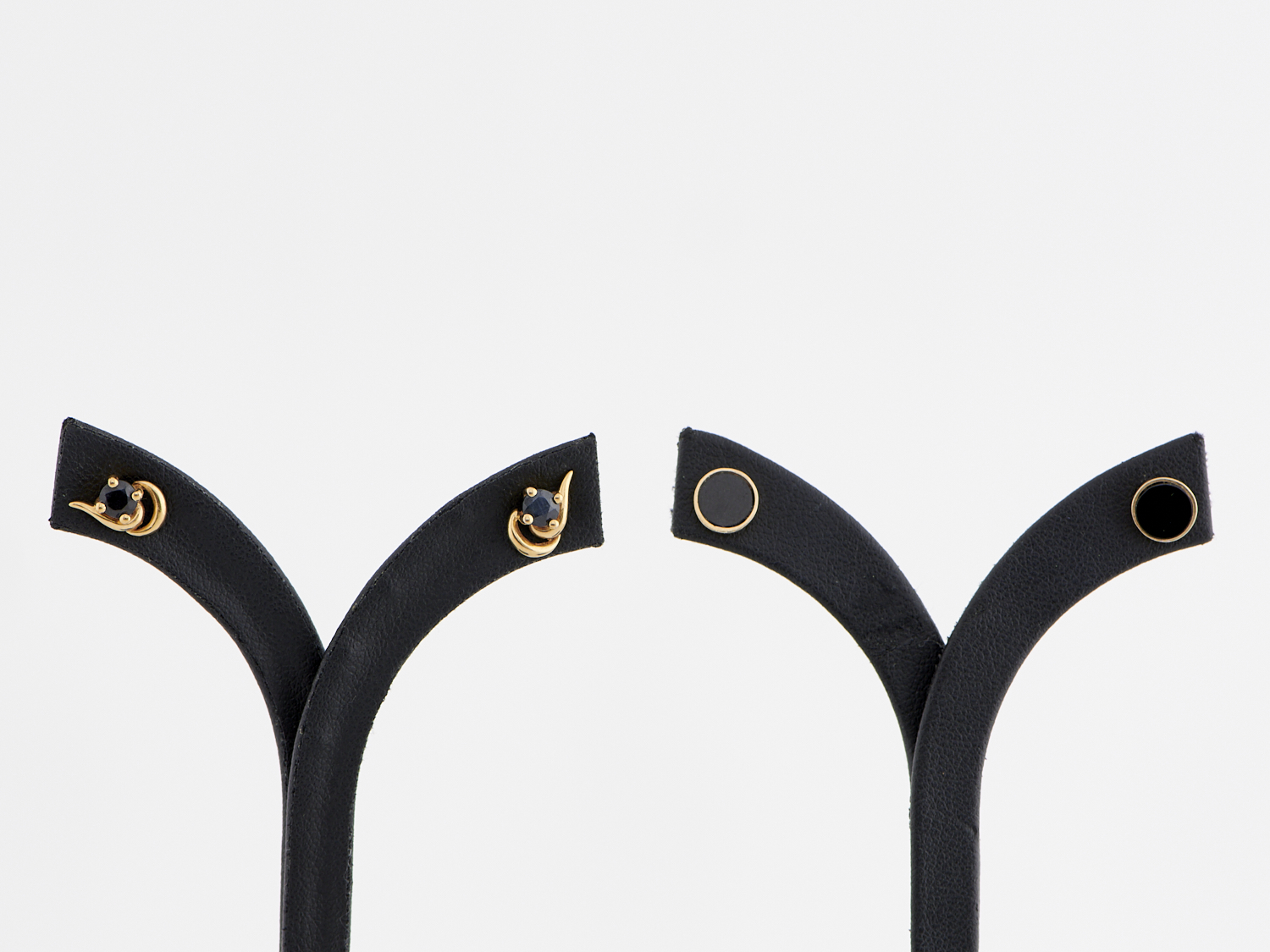 A PAIR OF ONYX STUDS TOGETHER WITH A PAIR OF SAPPHIRE STUDS IN 9CT GOLD, TOTAL WEIGHT 2.4GMS