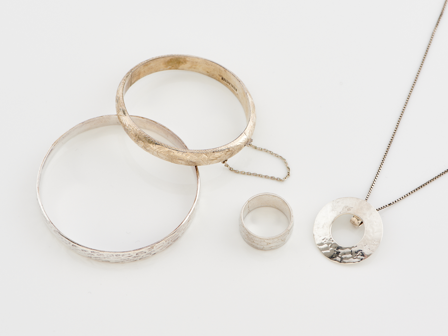 A COLLECTION OF VINTAGE JEWELLERY IN SILVER, INCLUDING TWO BANGLES, PENDANT AND RING, RING SIZE U