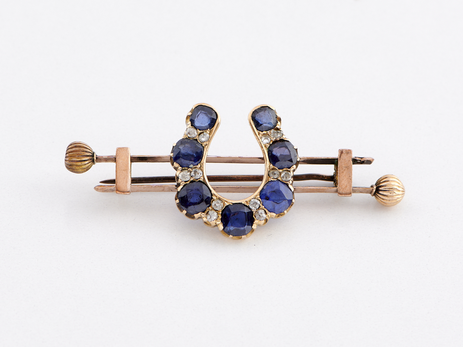 AN ANTIQUE SAPPHIRE AND DIAMOND SET HORSE SHOE BAR BROOCH IN 9CT GOLD, LENGTH 55MM, 7.7GMS