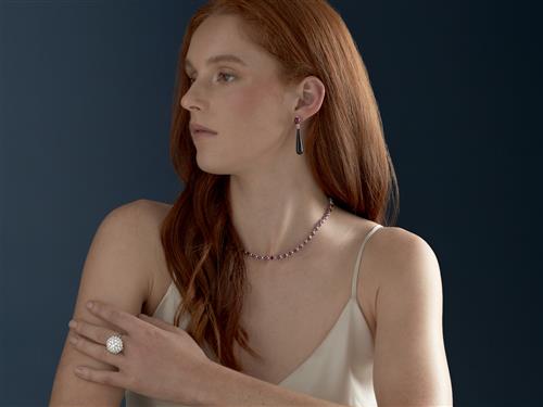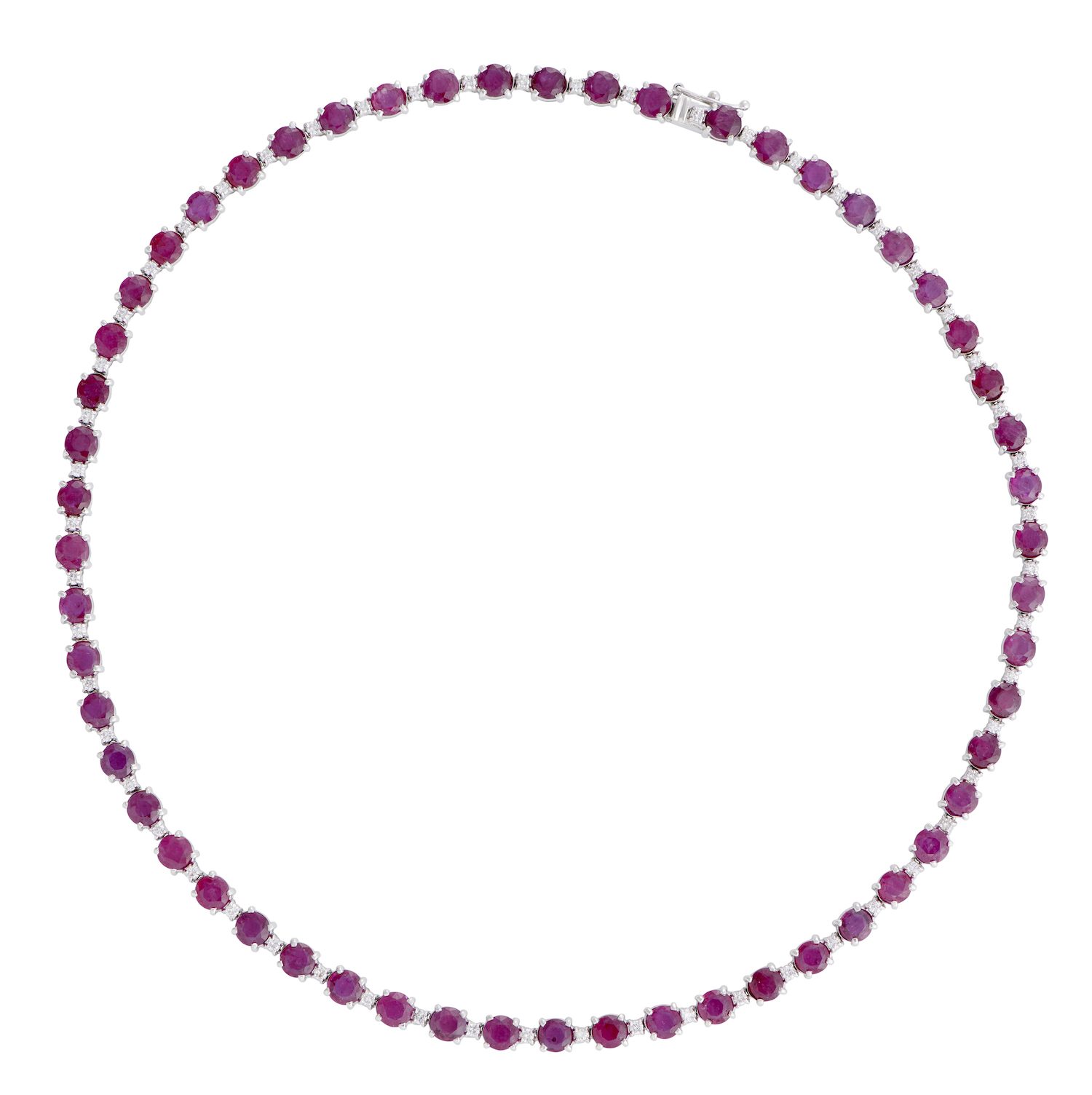 A RUBY AND DIAMOND NECKLACE IN 18CT WHITE GOLD, DESIGNED AS A CONTINUOUS LINE OF FIFTY-FIVE CLAW-SET CIRCULAR-CUT RUBIES TOGETHER WEIGHING APPROXIMATELY 29.30 CARATS, SPACED BY CLAW-SET BRILLIANT-CUT DIAMONDS TOGETHER WEIGHING APPROXIMATELY 0.94 CARATS, COMPLETED BY A BOX CLASP, LENGTH APPROXIMATELY 420MM, ACCOMPANIED BY A VALUATION
