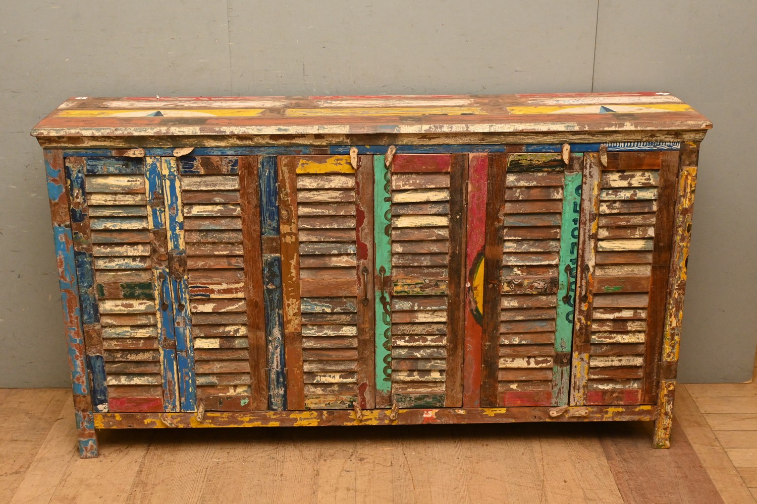 A SIX DOOR REPURPOSED WOOD SIDEBOARD. (102 H X 182W X 41D CM) (PLEASE NOTE THIS HEAVY ITEM MUST BE REMOVED BY CARRIERS AT THE CUSTOMER'S EXPENSE. LEONARD JOEL STAFF CANNOT ASSIST CARRYING THIS ITEM) (X-LARGE ITEM)