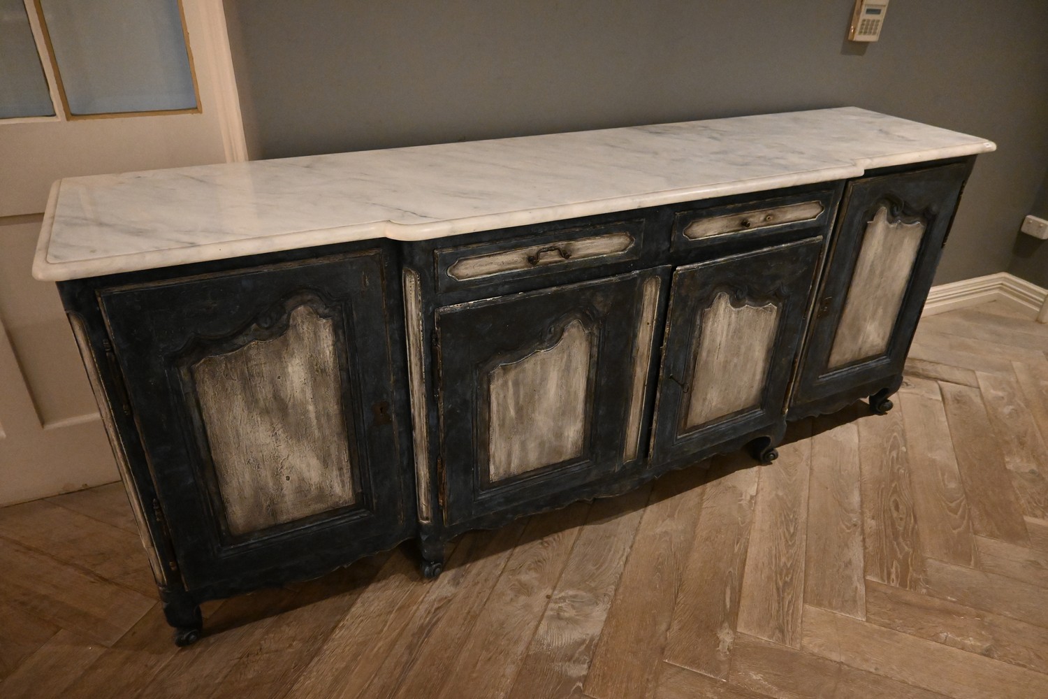 A SUBSTANTIAL FRENCH LOUIS XVI STYLE MARBLE TOPPED BUFFET. A/F (100H X 245W X 60D) (PLEASE NOTE THIS HEAVY ITEM MUST BE REMOVED BY CARRIERS AT THE CUSTOMER'S EXPENSE. LEONARD JOEL STAFF CANNOT ASSIST CARRYING THIS ITEM) (X-LARGE ITEM)