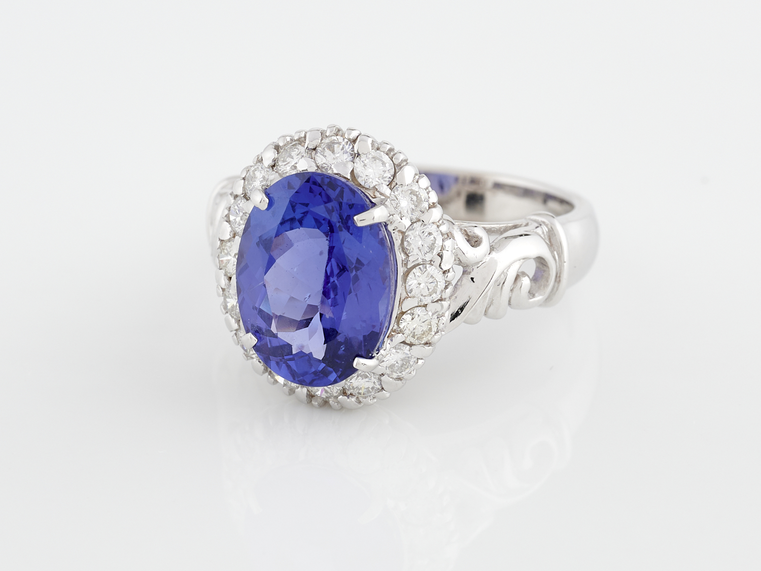 A TANZANITE AND DIAMOND SET RING IN 18CT WHITE GOLD, THE OVAL CUT TANZANITE OF 4.85CTS WITH SHOULDERING DIAMONDS TOTALLING 1.18CTS, RING SIZE O/P, ACCOMPANIED BY VALUATION