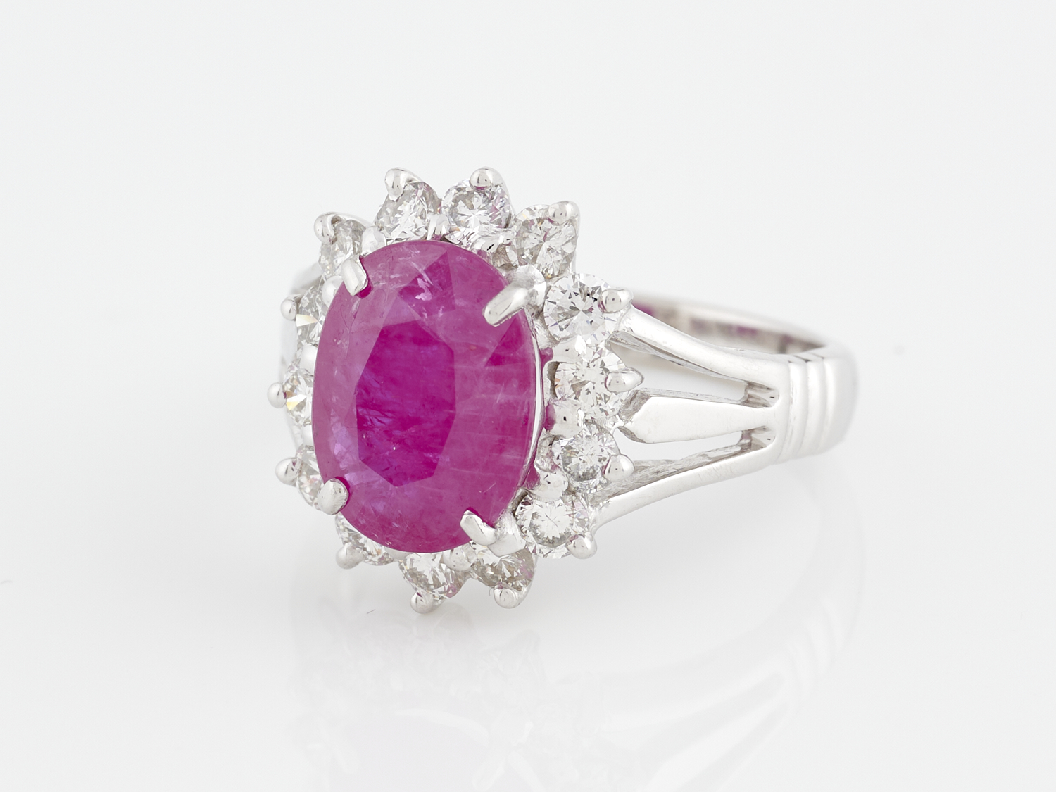 A MOZAMBIQUE RUBY AND DIAMOND RING IN 18CT WHITE GOLD, THE RUBY OF 4.23CTS WITH SURROUNDING DIAMONDS TOTALLING 1.12CTS (VS,F), RING SIZE O, ACCOMPANIED BY AIG CERTIFICATE AND VALUATION
