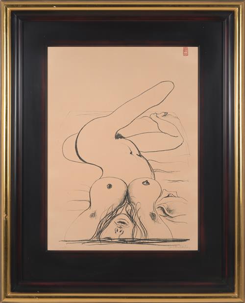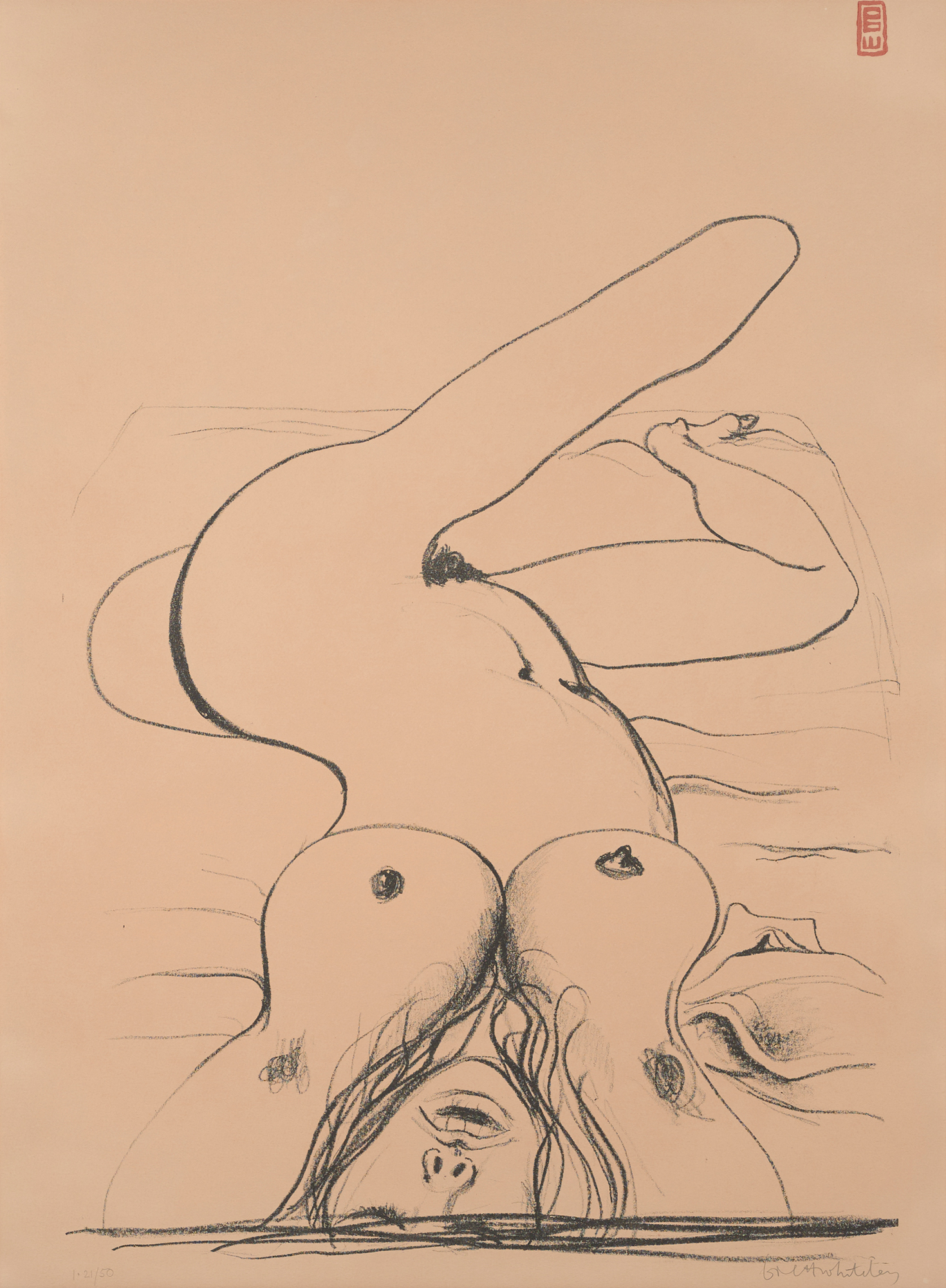 Whiteley was an extremely talented printmaker who utilised a unique medium approach that combined both traditional printmaking techniques and his own inimitable vision. His works focus on the exploration of form and line, combined with an experimental use of colour and varied printing techniques. A celebration of the nude female body is one of the artists most persistent themes, capturing the form across multiple mediums, including printmaking. Lithography for the sensual line of the nude accentuates the flattening of the perspective that he so admired. The 'Towards Sculpture' 1977 series consists of eight lithographs that exhibits this beautifully and encapsulates intimate beauty and the use of loose and poetic line.