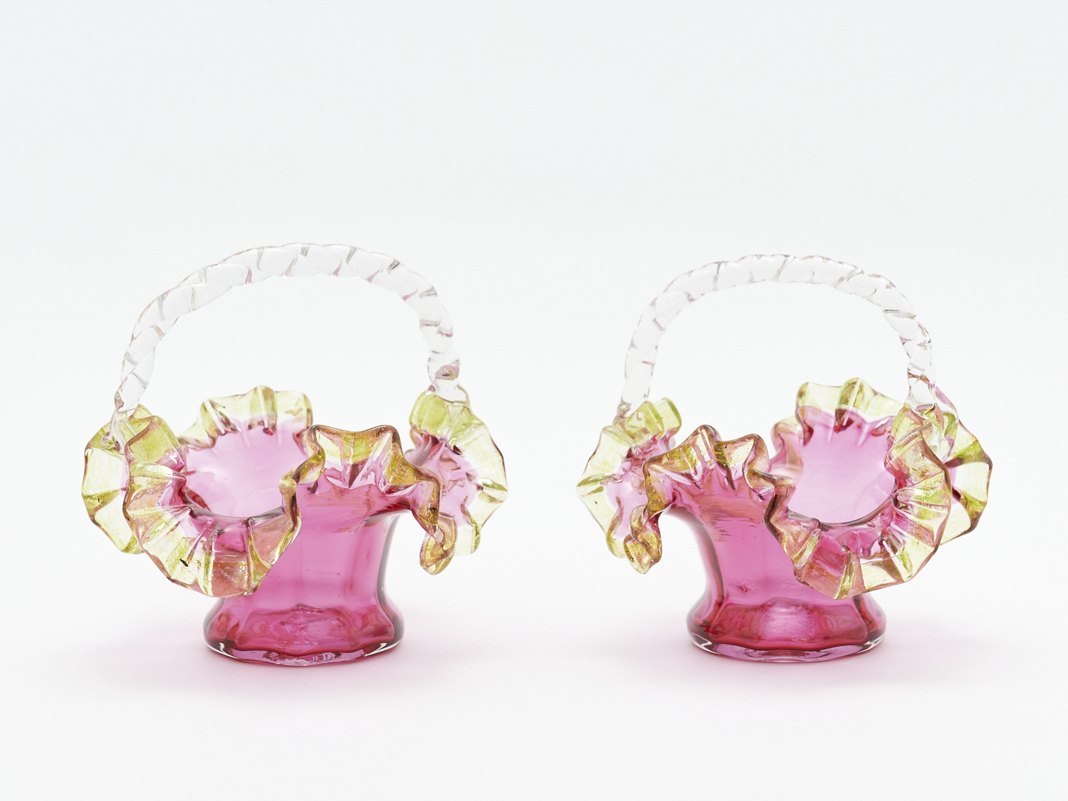 A PAIR OF RUBY GLASS FRILLED BASKETS, H.13CM, LEONARD JOEL LOCAL DELIVERY: SMALL