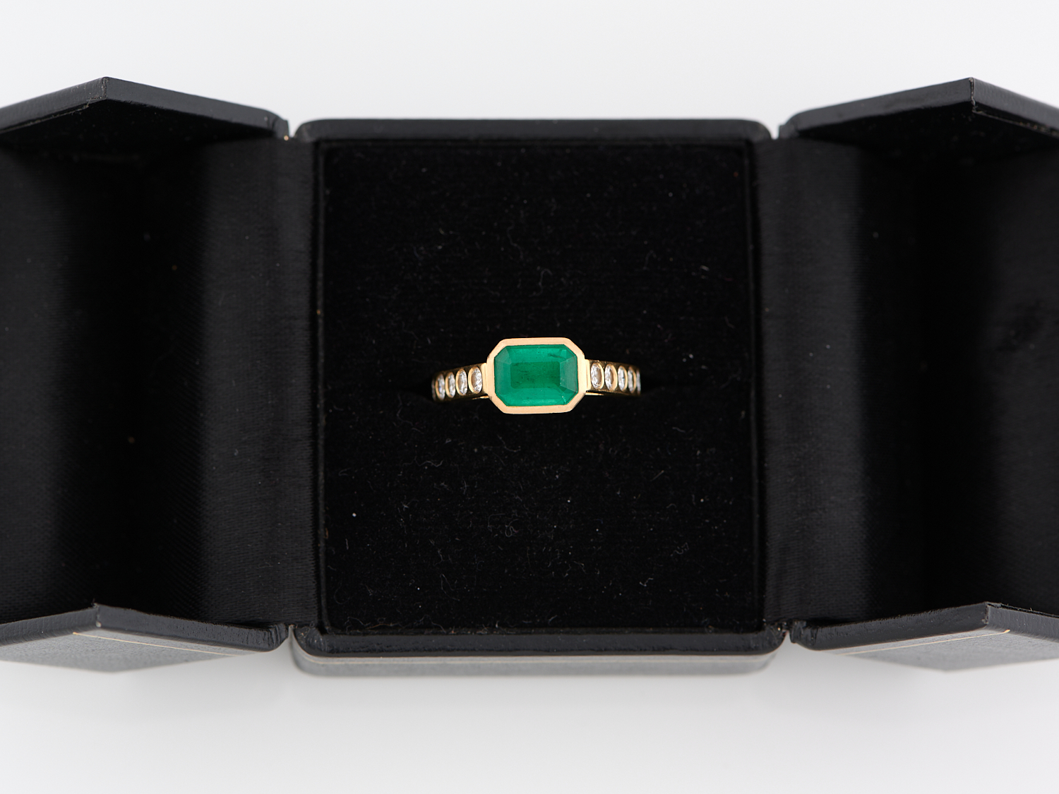 AN EMERALD AND DIAMOND RING IN 18CT GOLD, RING SIZE O, 5.6GMS