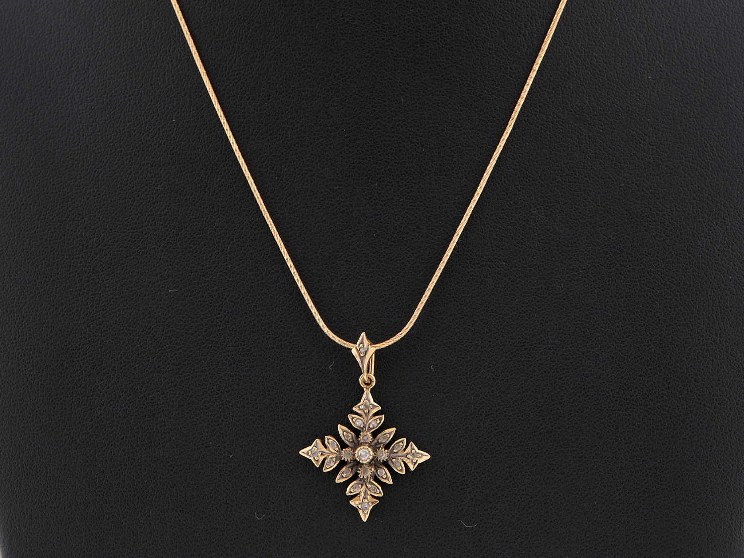 AN DIAMOND SET PENDANT IN 18CT GOLD TO A CHAIN IN 9CT GOLD, LENGTH 450MM, 4.9GMS