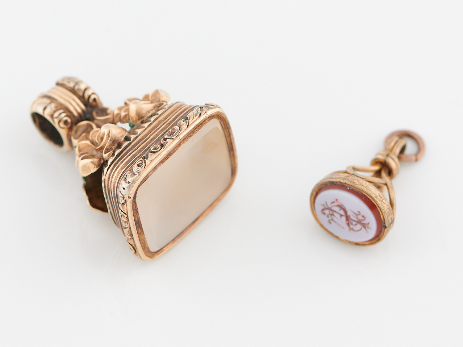 TWO ANTIQUE AGATE SEALS IN GOLD LINED METAL, LENGTHS 30MM AND 21MM
