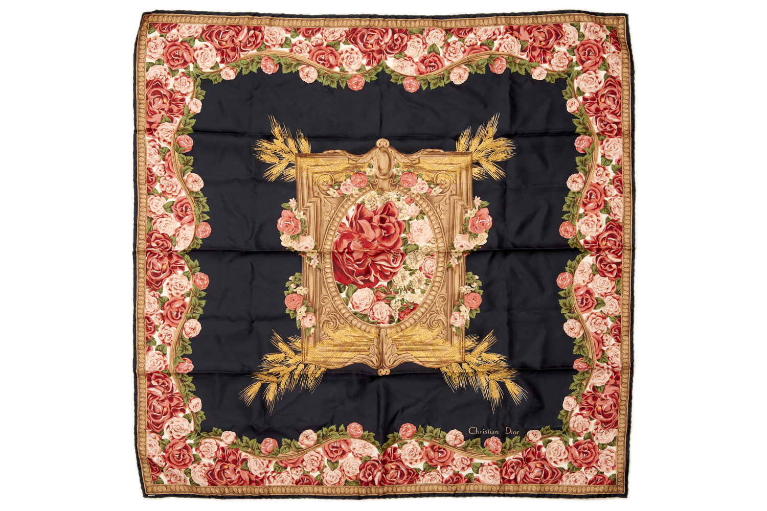 DIOR, SILK SCARF, STYLED FEATURING A FLORAL PRINT TO A BLACK BACKGROUND, 90CM SQUARED