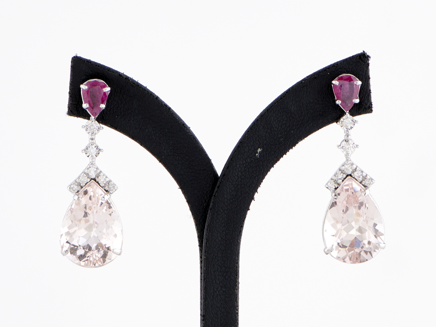 A PAIR OF MORGANITE, RUBY AND DIAMOND EARRINGS IN 18CT WHITE GOLD, TO POST AND BUTTERFLY FITTINGS, THE MORGANITE TOTALLING APPROXIMATELY 16.74CTS, THE RUBIES TOTALLING APPROXIMATELY 1.60CTS AND THE DIAMONDS TOTALLING APPROXIMATELY 0.38CTS, SIZE 12 X 37MM, WEIGHT 9GMS