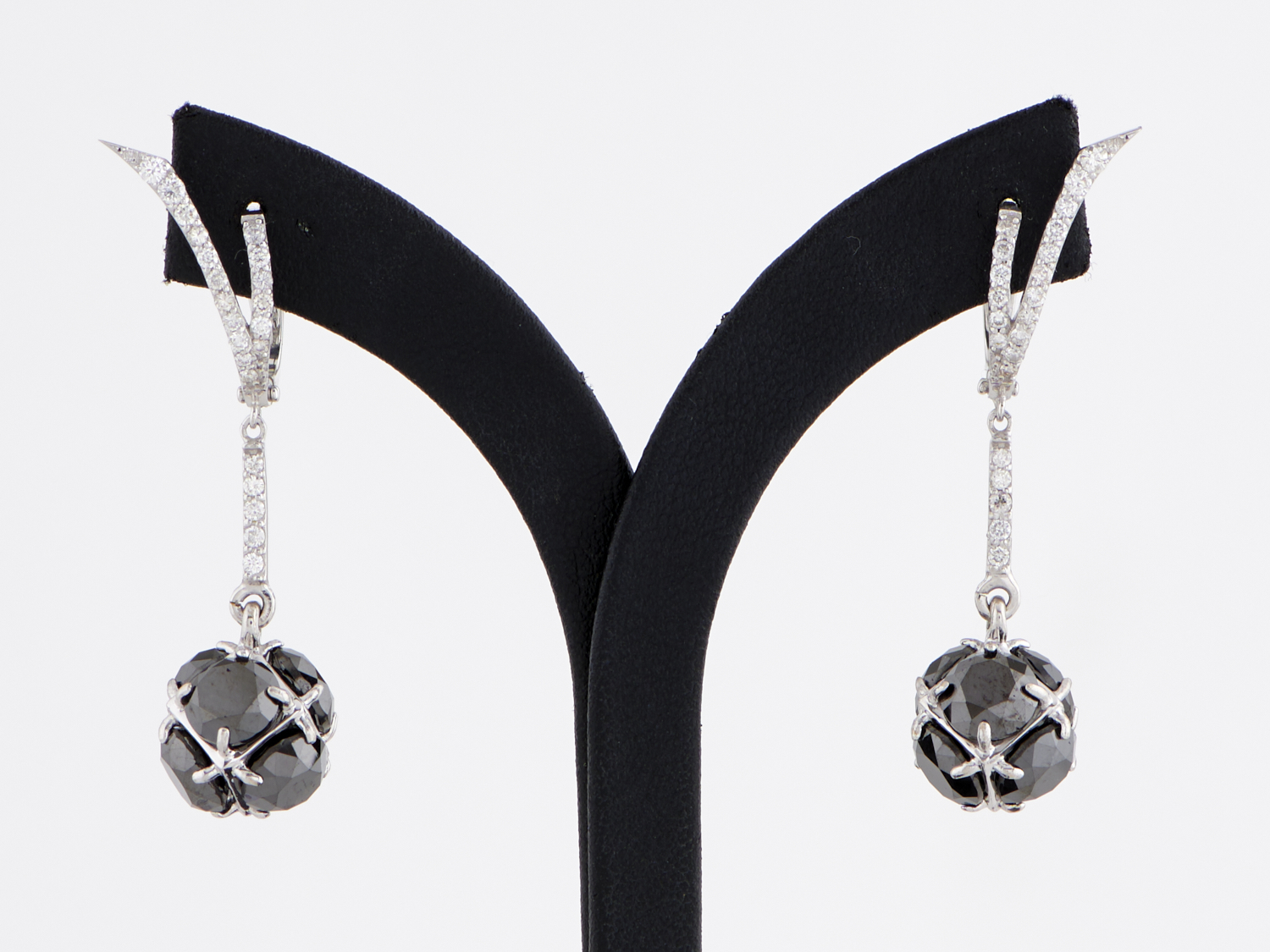 A PAIR OF BLACK DIAMOND AND DIAMOND DROP EARRINGS IN 18CT WHITE GOLD, THE BLACK DIAMONDS TOTALLING 18.60CTS WITH WHITE DIAMONDS TOTALLING 0.78CTS, TO POST AND LEVER BACK FITTINGS
