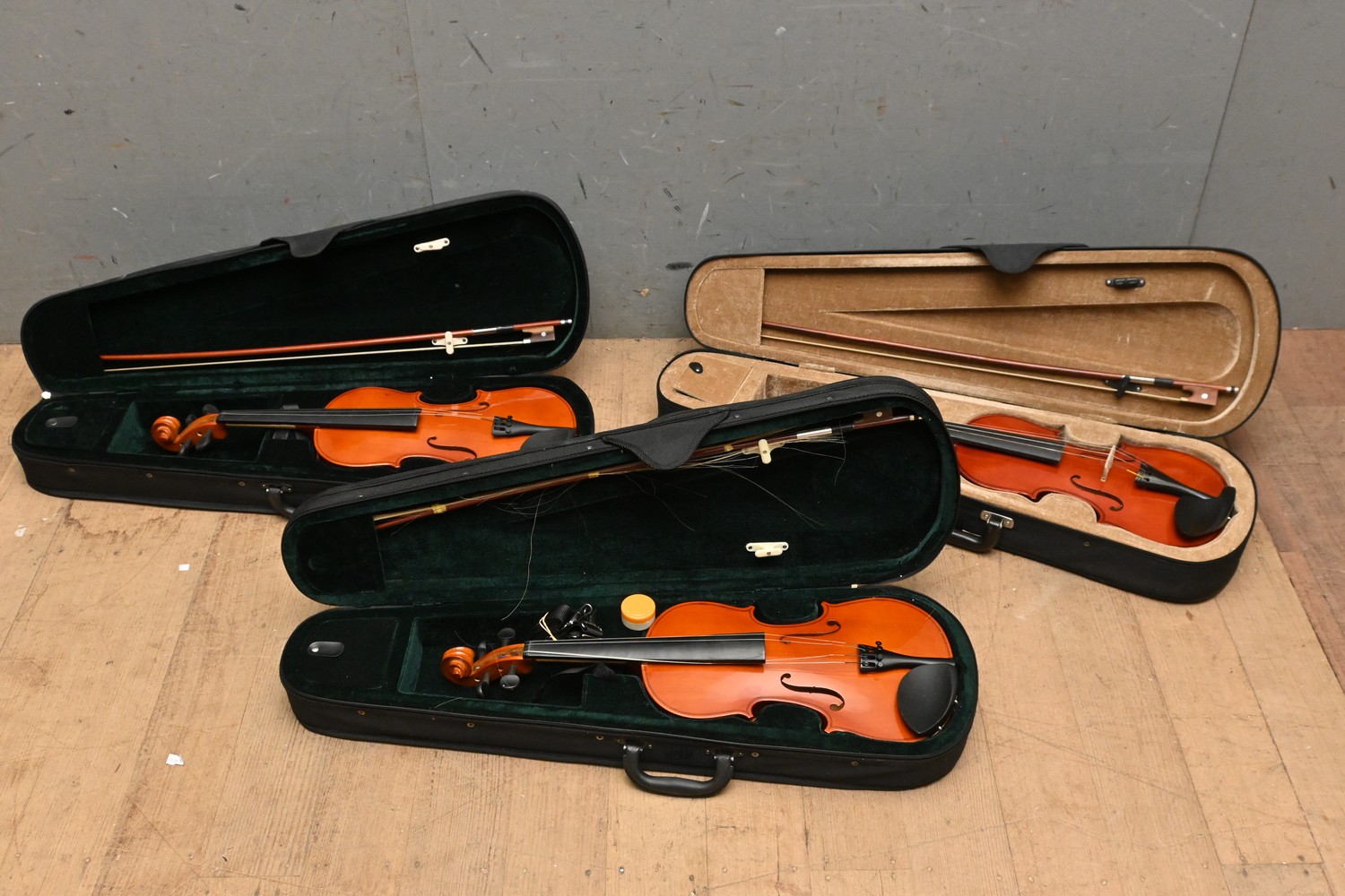COLLECTION OF THREE CONTEMPORARY CASED VIOLINS WITH BOWS (A/F) (80CM) (LEONARD JOEL DELIVERY SIZE: LARGE)