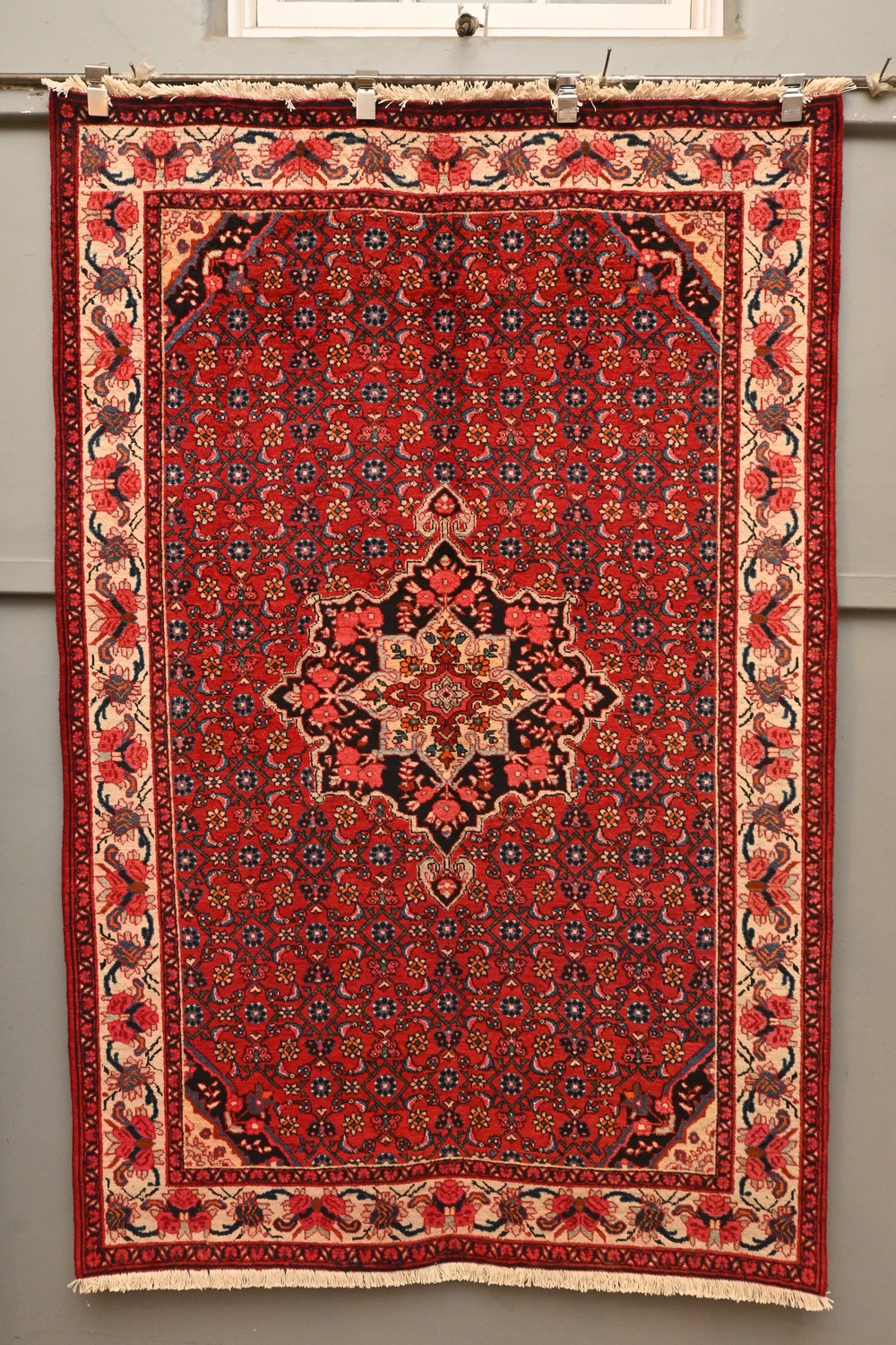 MOST SOLID BIDJAR GHOLTOGH RUG IN TRIBAL HERATI MOTIFS. EXTREMLEY DENSELEY HANK KNOTTED FOR EXTRA DURABILITY IN A TRADITIONAL BIDJAR GHOLTOGH DESIGNS, WOVEN IN THE KURDISH PROVINCE OF KURDISTAN IN PERSIA. 100% DENSE WOOLLEN PILE AND ALL NATURAL DYES IN ARICH CRIMSON FIELD WITH PERSIAN NAVY BLUE MEDALION AND IVORY BORDER. SIZE: 202 X 135 CM, ORIGIN: CENTRAL WEST IRAN RRP - $2,500 DOCUMENTATION OF AUTHENTICITY INCLUDED