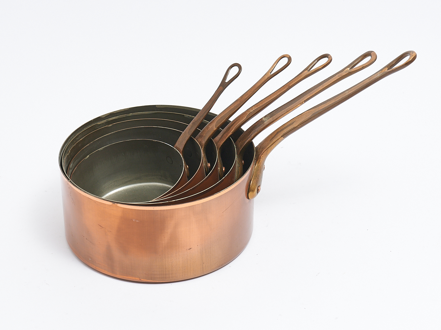 A GRADUATED SET OF FIVE EARLY 20TH CENTURY FRENCH COPPER SAUCEPANS, DIA.20CM (LARGEST), LEONARD JOEL LOCAL DELIVERY: MEDIUM