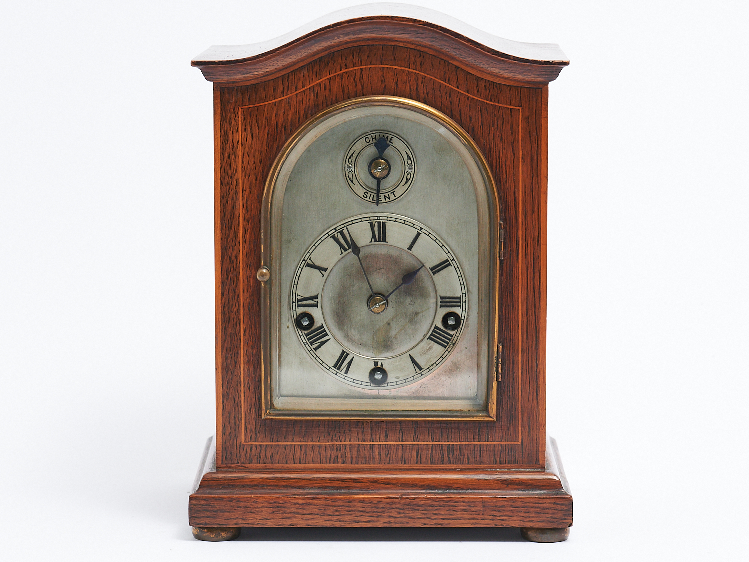 AN OAK CASED SILVERED DIAL MANTLE CLOCK WITH KEY, H.23CM, LEONARD JOEL LOCAL DELIVERY: MEDIUM