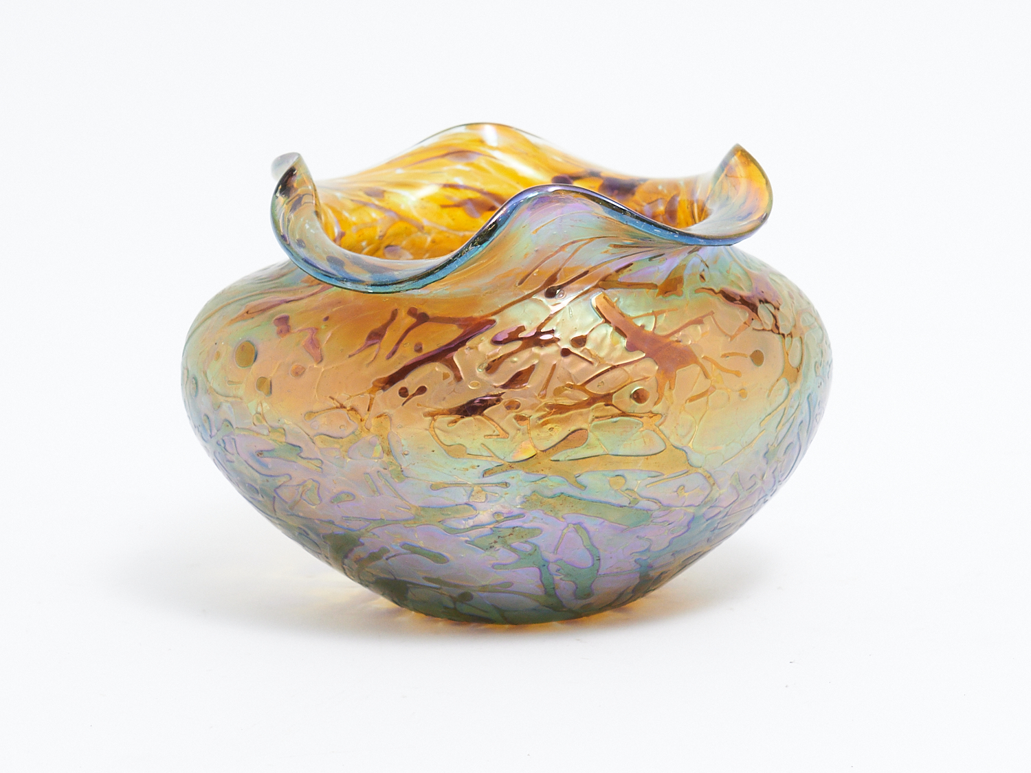 AN IRIDESCENT LOETZ STYLE FRILLED EDGE VASE H.10CM, LEONARD JOEL LOCAL DELIVERY: SMALL