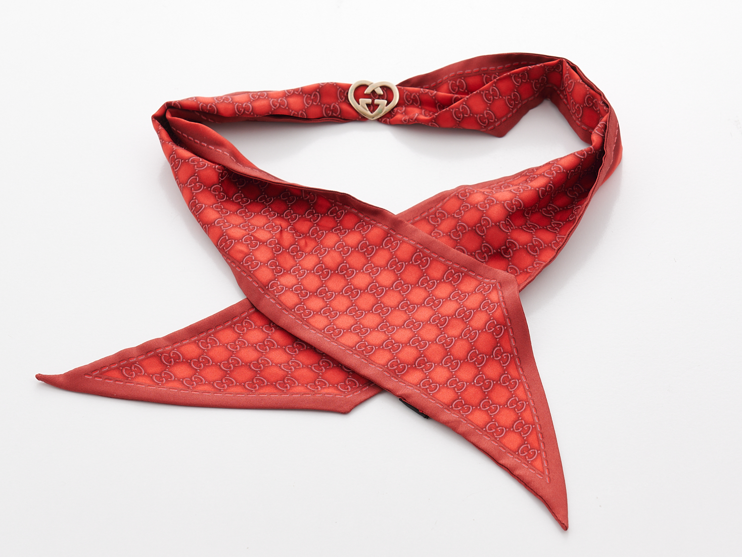 GUCCI, SILK TWILLY - Styled in GG web print with heart shaped scarf ring, 9 x 90cm.