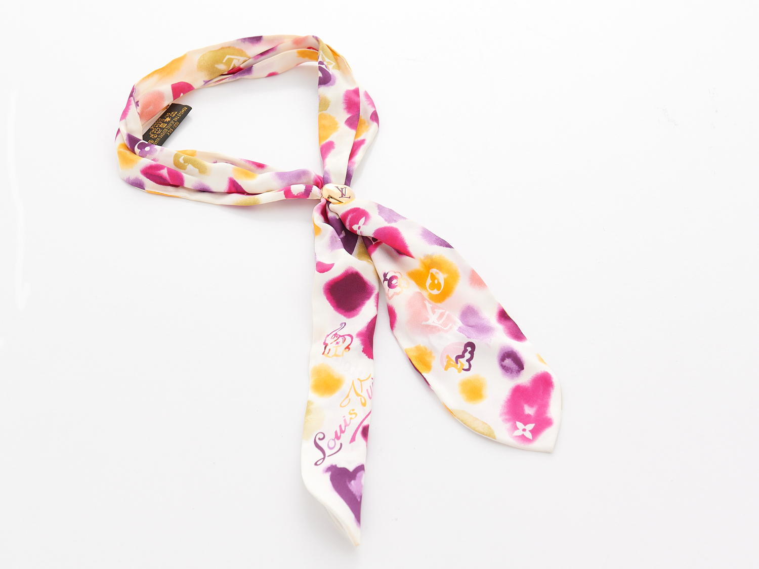 LOUIS VUITTON, A SILK TWILLY WITH SCARF RING, STYLED IN MULTI COLOURED MONOGRAM PATTERN, 6 X 85CM