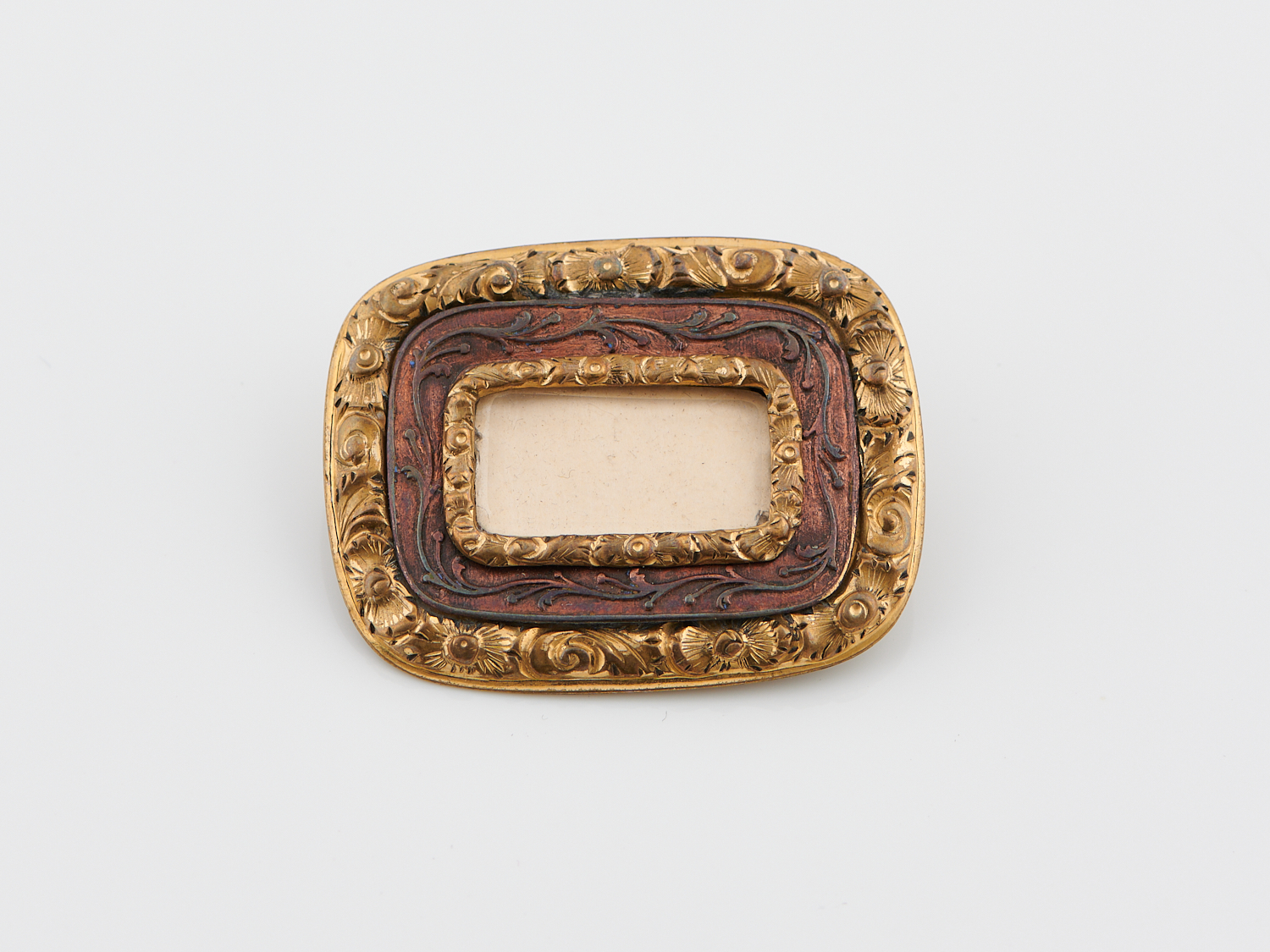 AN ANTIQUE MOURNING BROOCH IN GILT METAL, 39 X 30MM