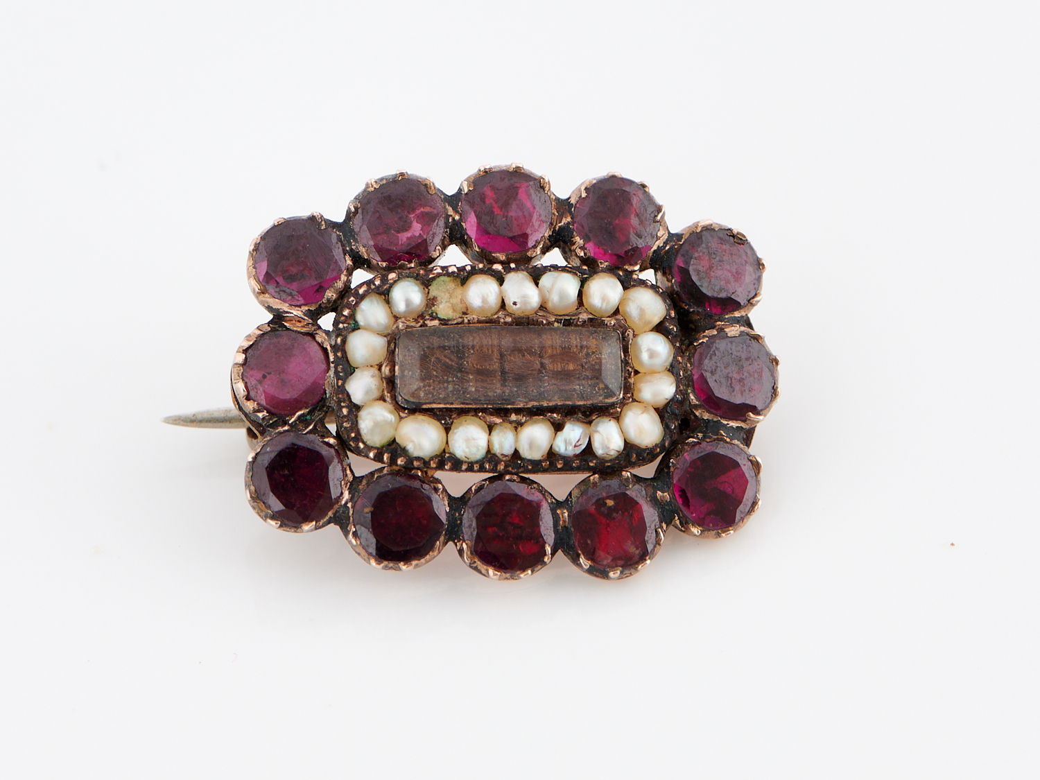 A VICTORIAN GARNET AND SEED PEARL MOURNING BROOCH, MEASURING 23MM X 16MM, A/F (ONE PEARL DEFICIENT)
